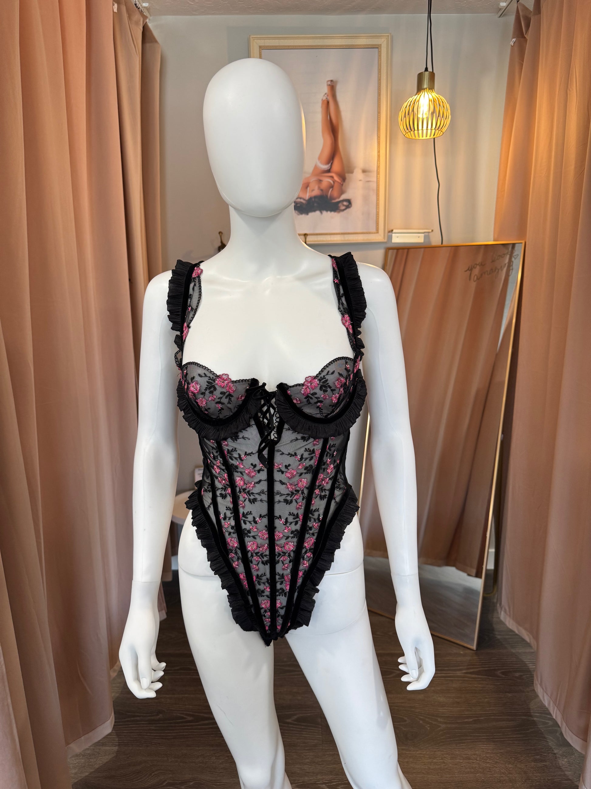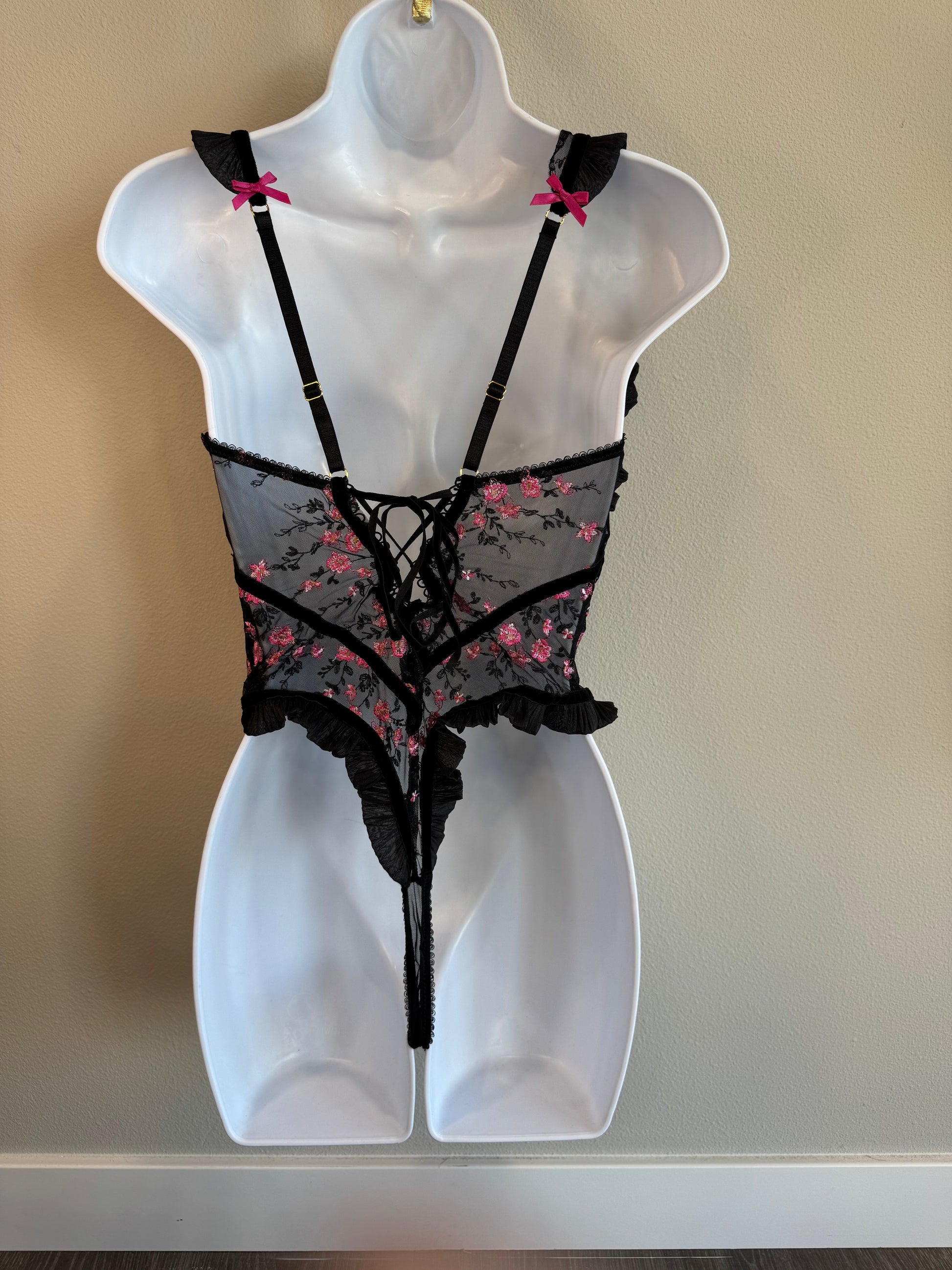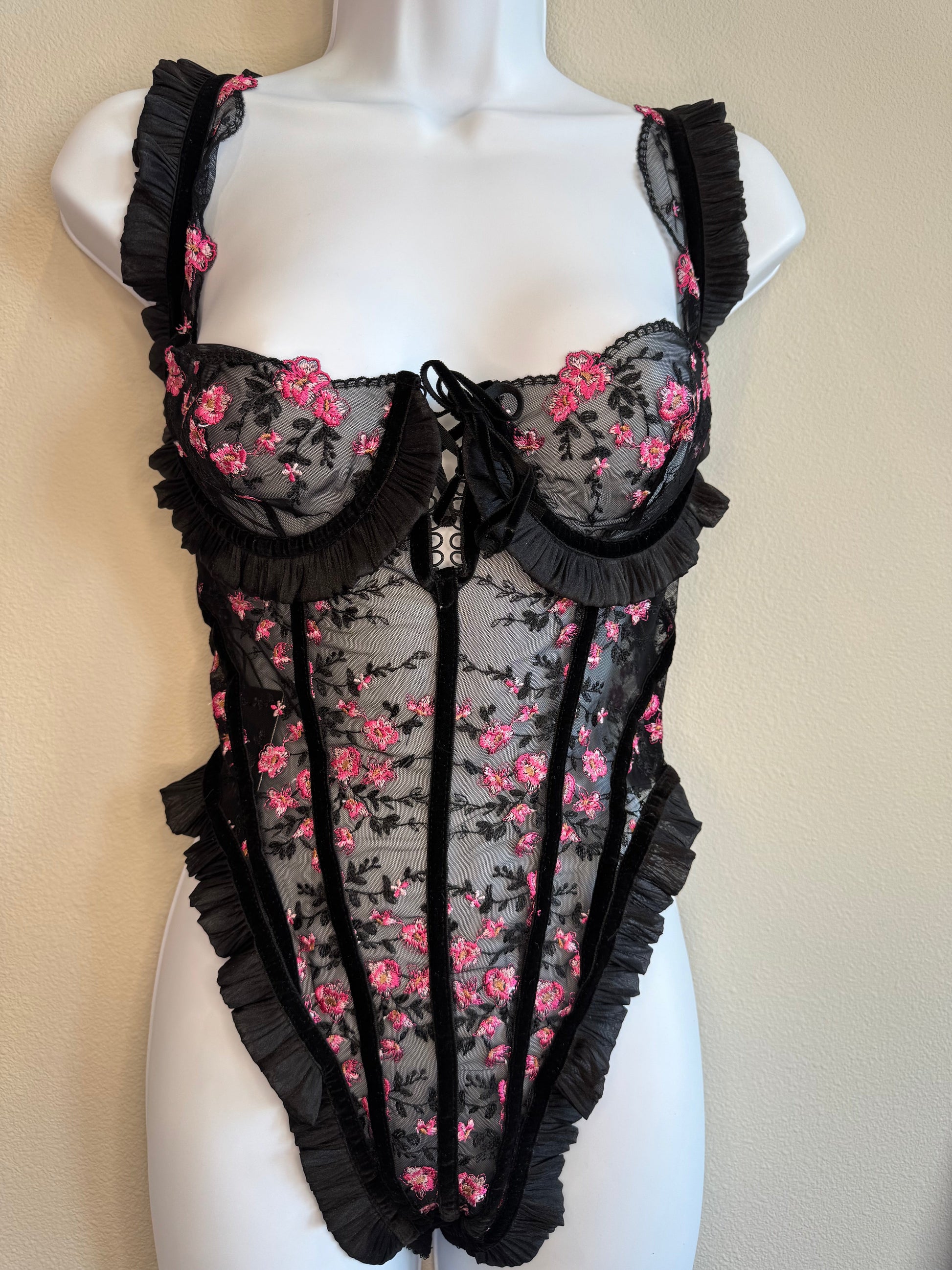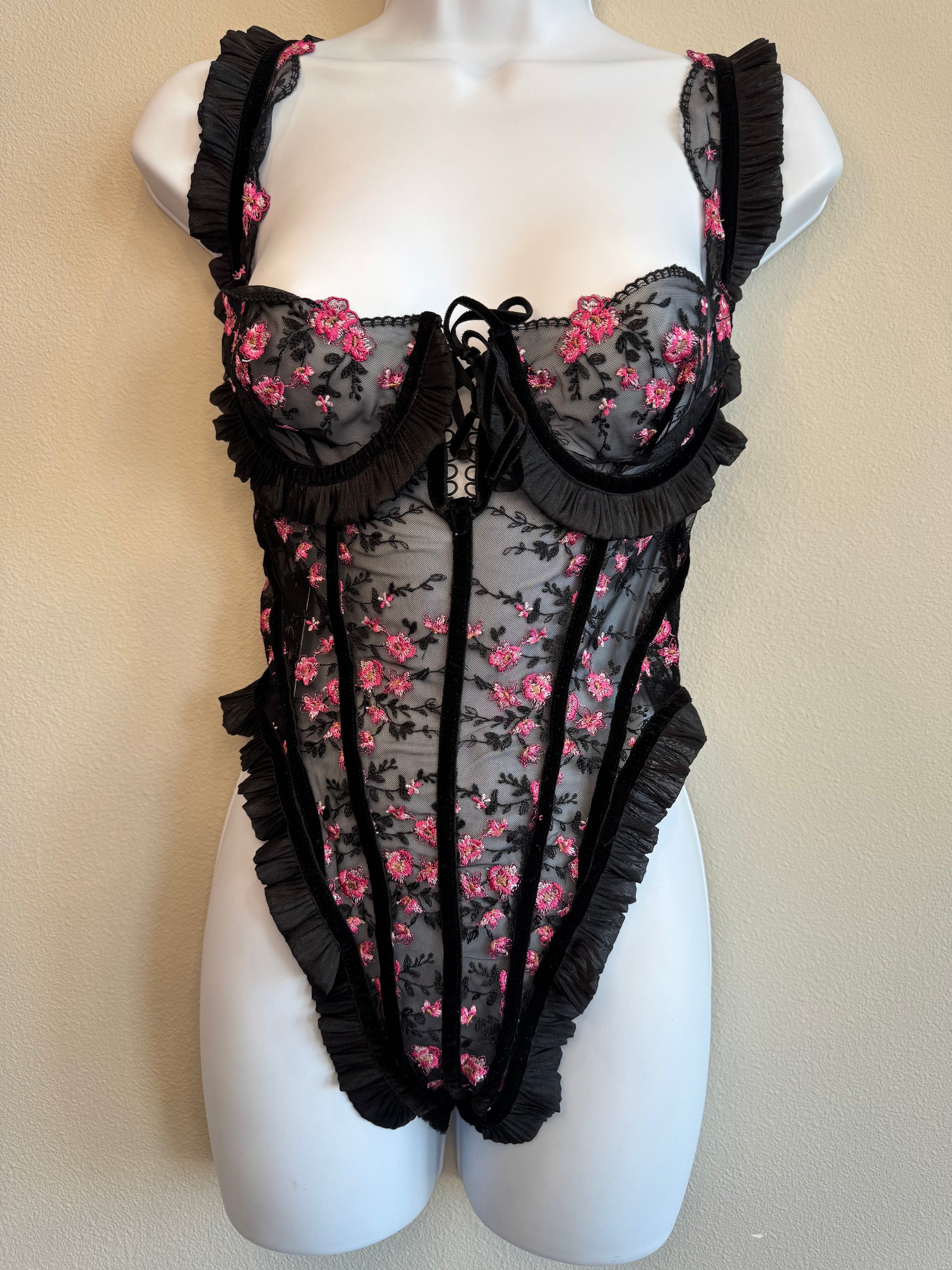 The Abigail Teddy is absolutely stunning! Its delicate combination of floral embroidery, scalloped edges, and ruffled trim creates a feminine and playful vibe. The sheer wired half-cups offer just the right amount of structure, while the adjustable straps and lace-up closures ensure a custom, flattering fit. The high-cut bottom adds a touch of elegance and elongates the legs, making it perfect for those nights you want to exude confidence and allure.
