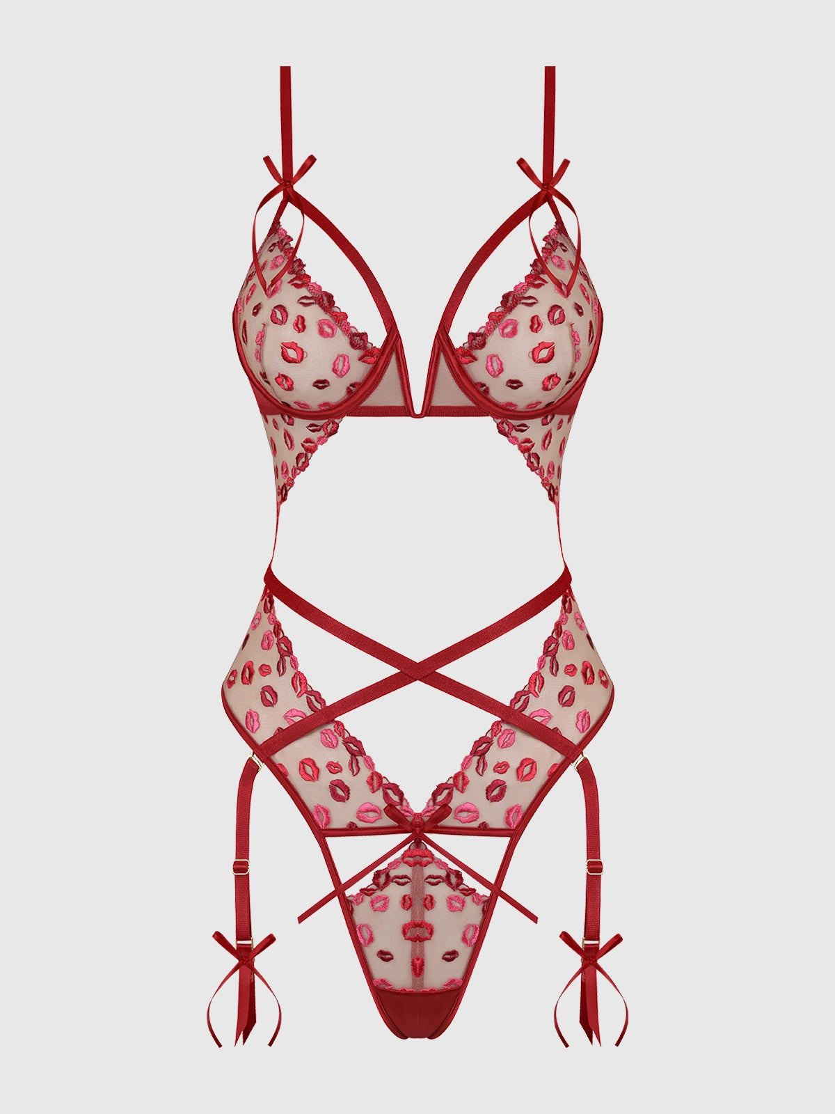 The Angelina Lips Embroidery Cutout Teddy displays coquette with a crimson kiss. Made for flirting and passionate play, this piece mixes bold open cuts and strappy detailing with charming adore-me-more bows and lace trim. Underwire offers a natural push while detachable garter straps serve major seduction.