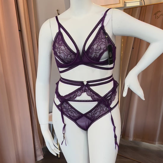 Strappy lace bra, garter and hipster set