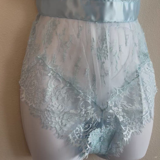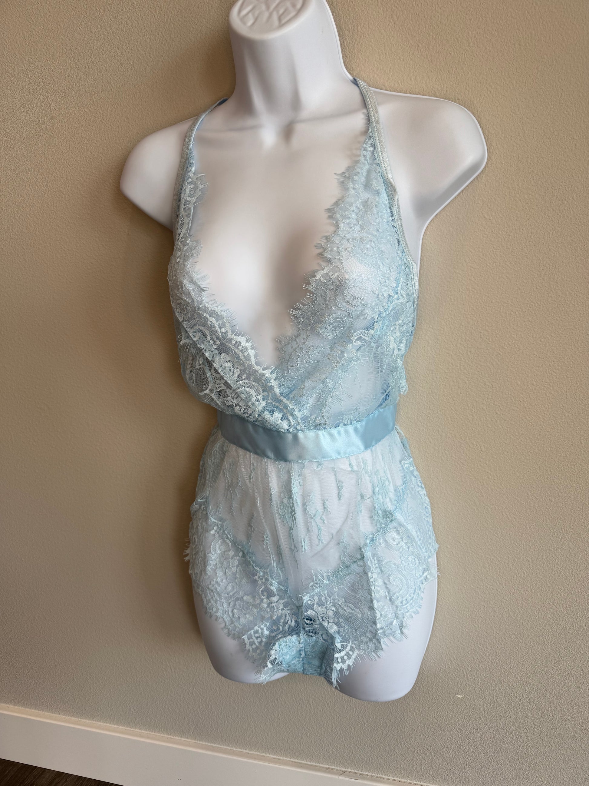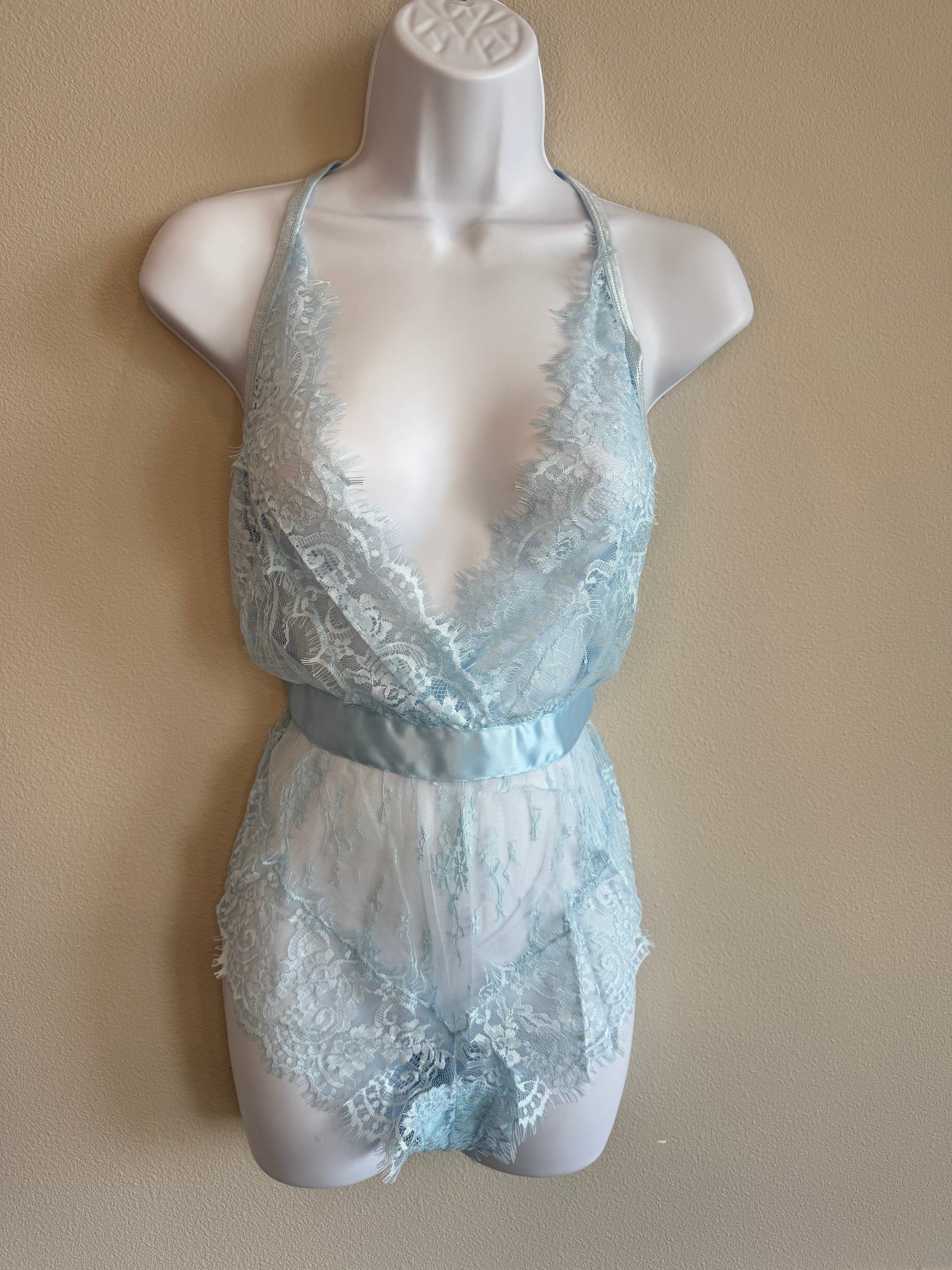 Beautiful lace romper with delicate eyelash trim and an open back featuring an adjustable ribbon tie closure. The perfect something blue for any bride to be!