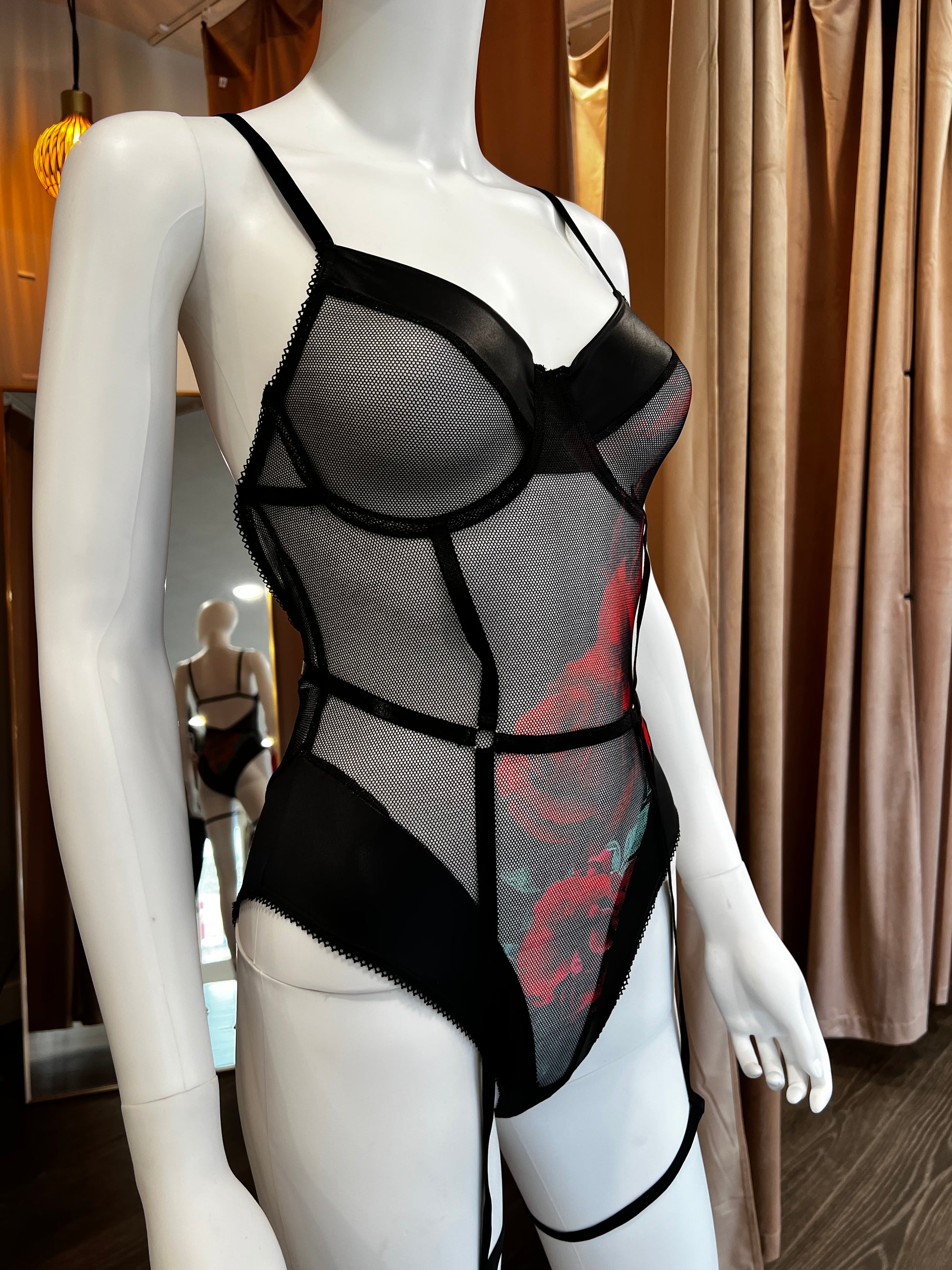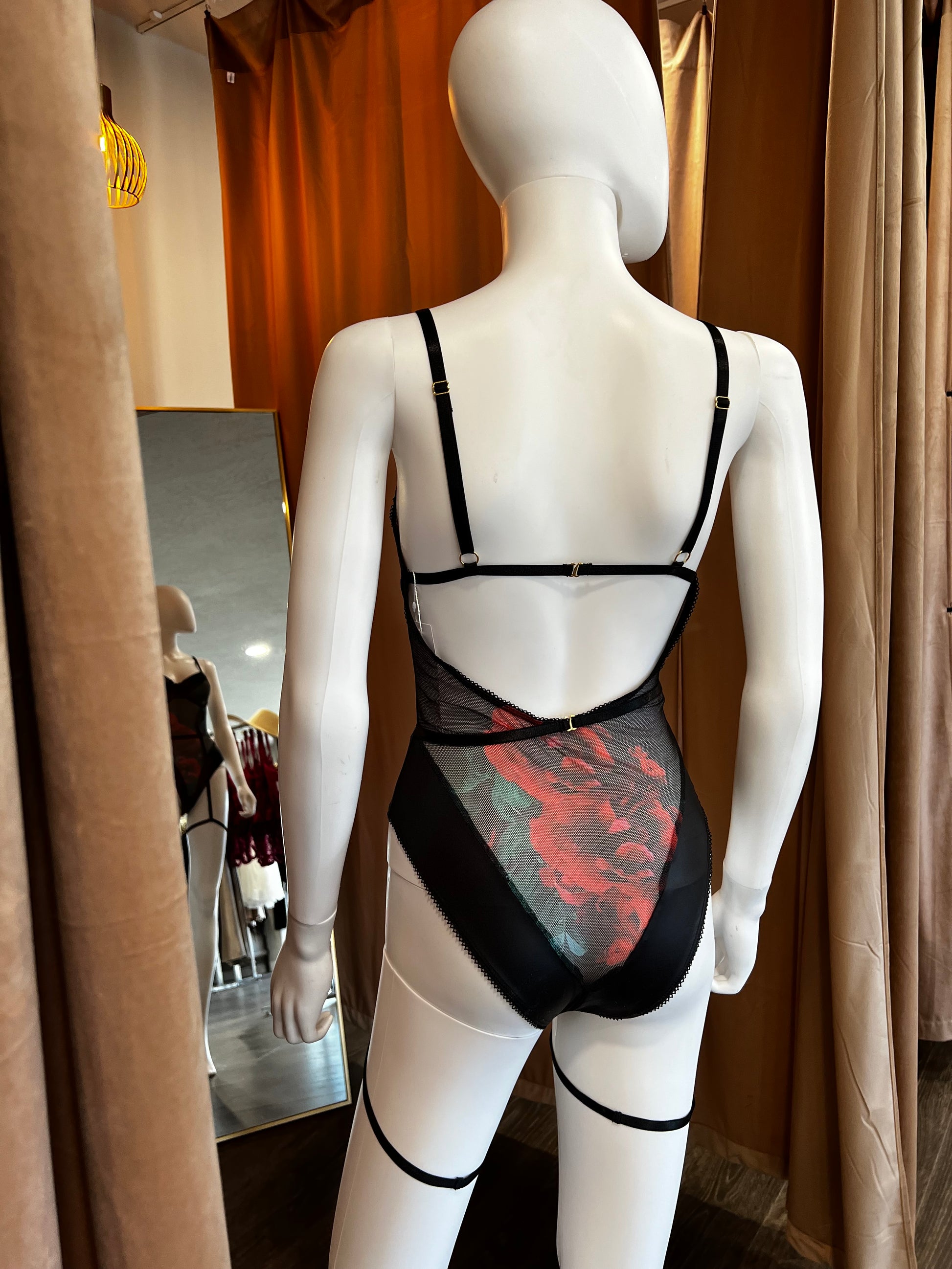 The combination of black and red roses creates a visually striking and romantic contrast. The attached garter belt not only adds an element of sensuality but also provides the option to pair the teddy with thigh-high stockings. It's a versatile choice for creating a captivating look.