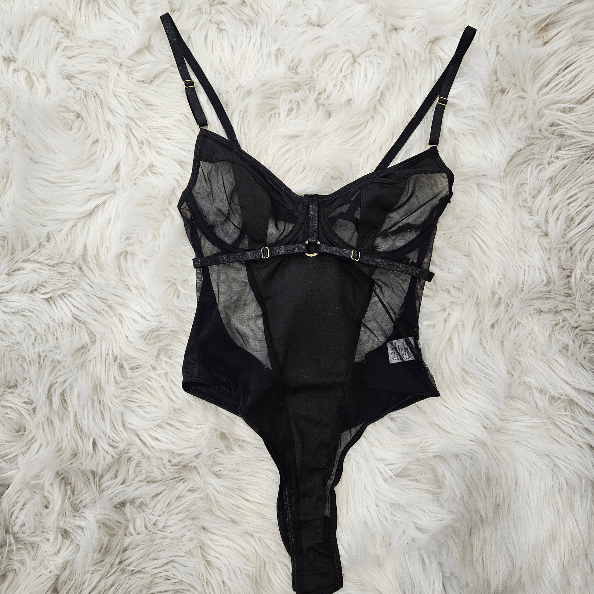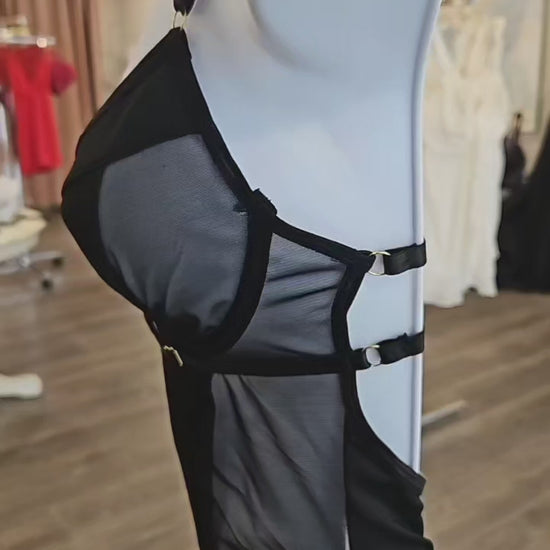 This strappy satin and mesh Bodysuit is the perfect blend of functional and sexy! Comes with optional thigh straps for extra spice.