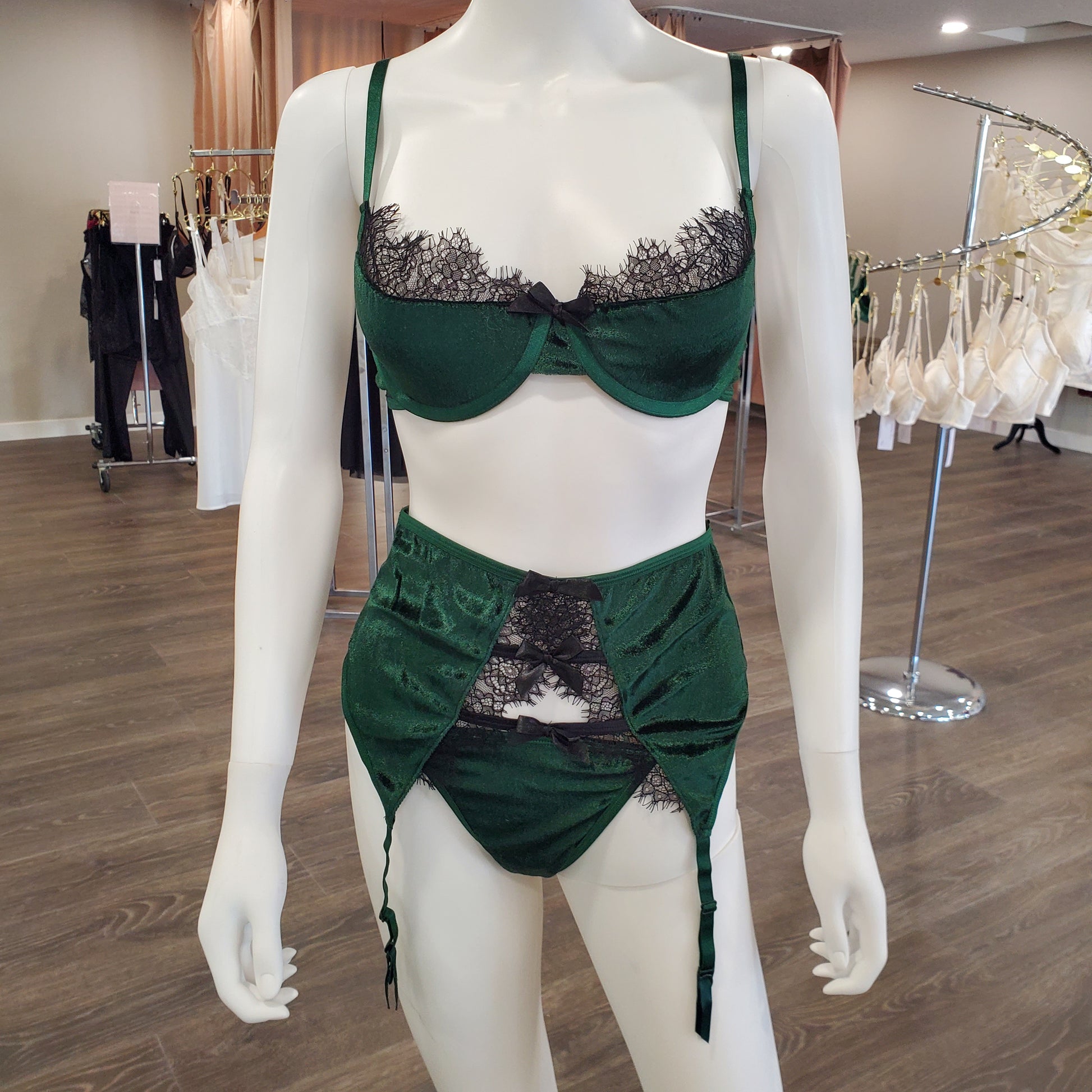 Meet Lexi, she is soft and sultry with dark green velvet, black eyelash lace and strappy details. You will love her fit and luxurious feel.