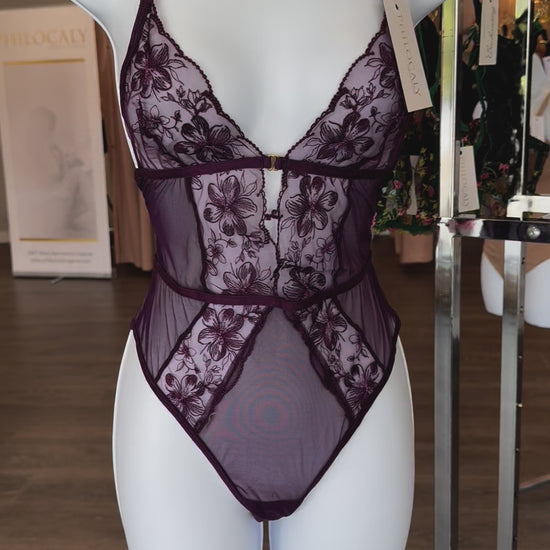 A flattering silhouette with subtle touches of shine. Embroidered and solid mesh panels, adjustable straps, medium coverage and adjustable crotch fastening.