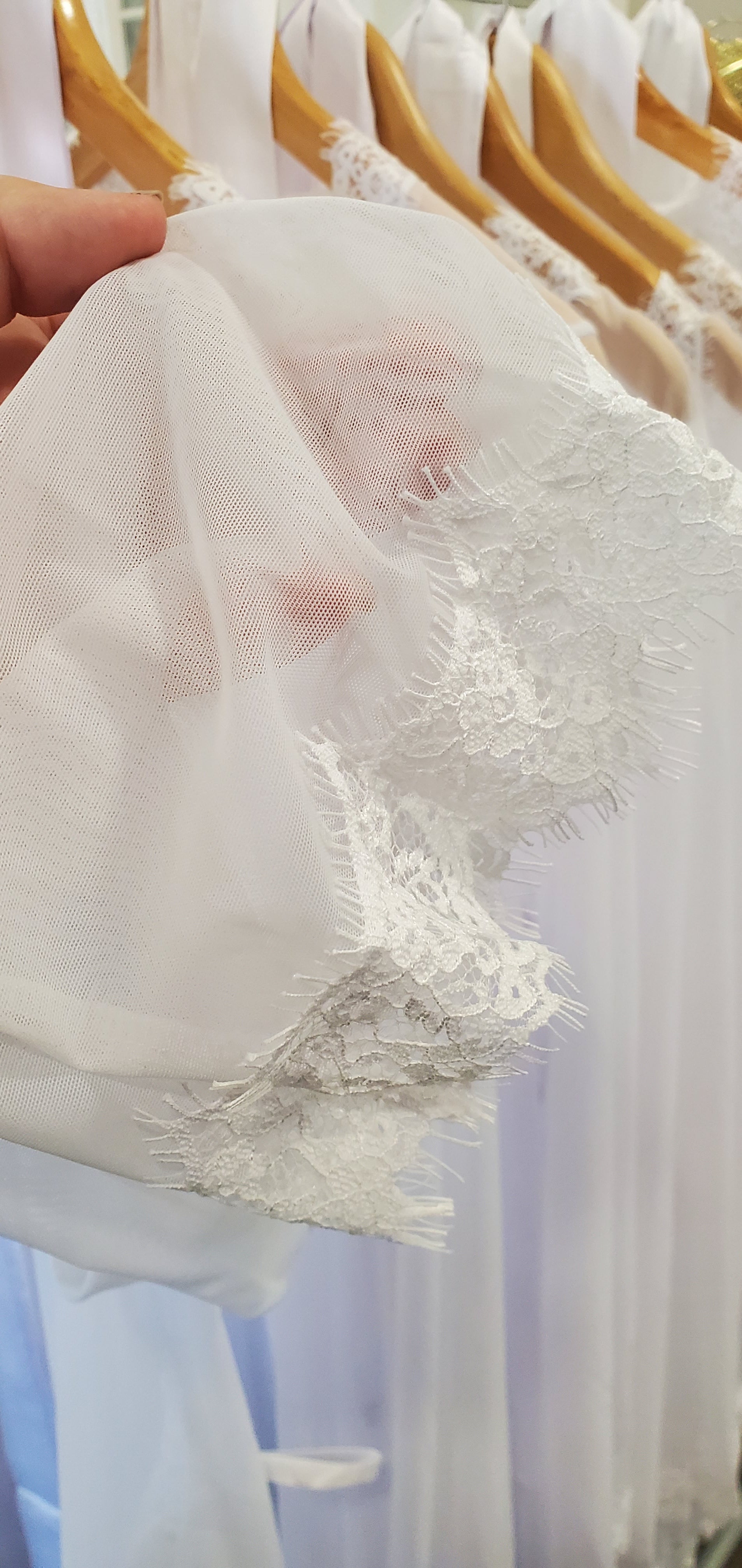 The perfect robe for romance. Sheer with eyelash lace and satin sash. Comes with a pretty thong with lace accents.
