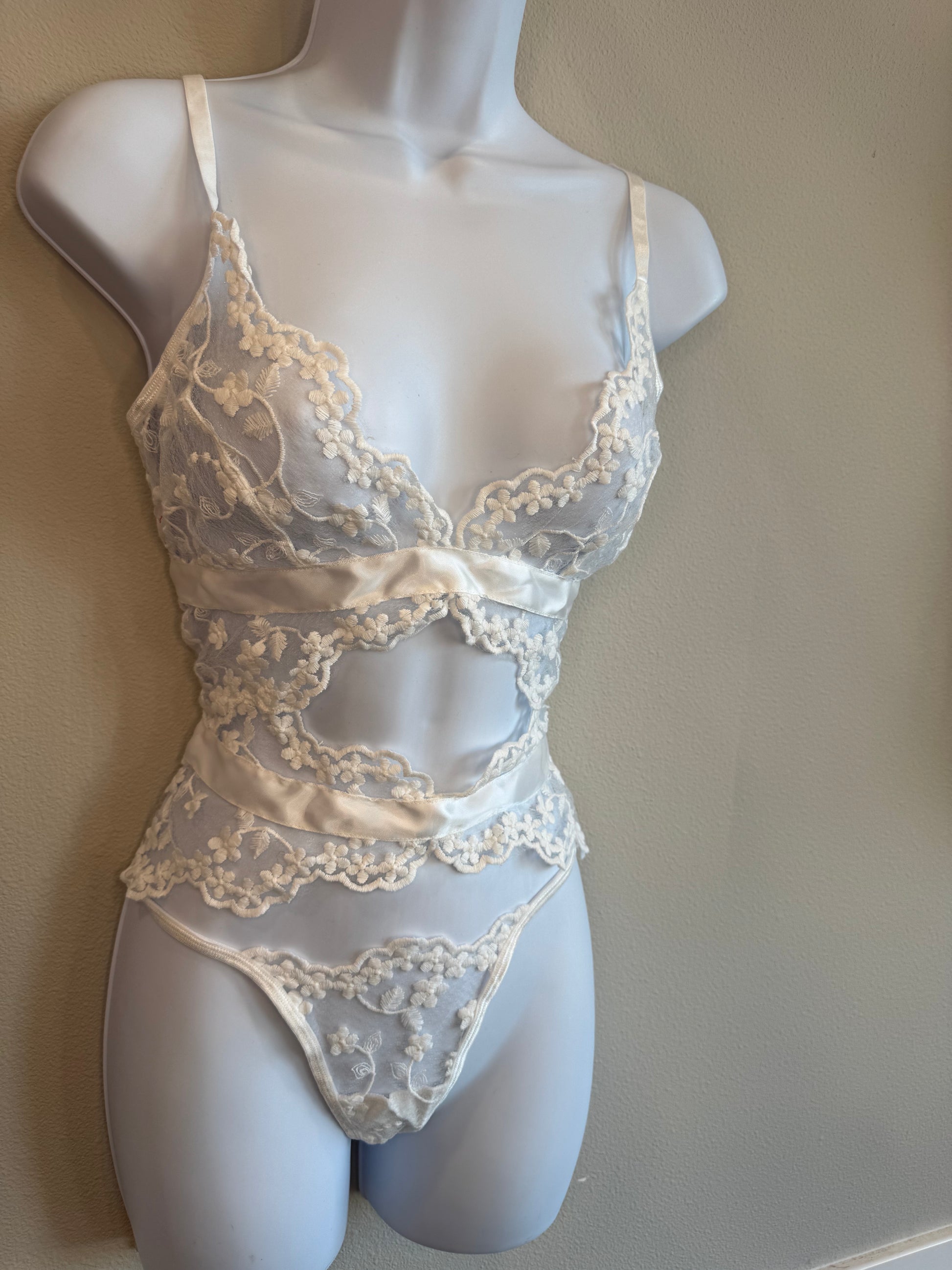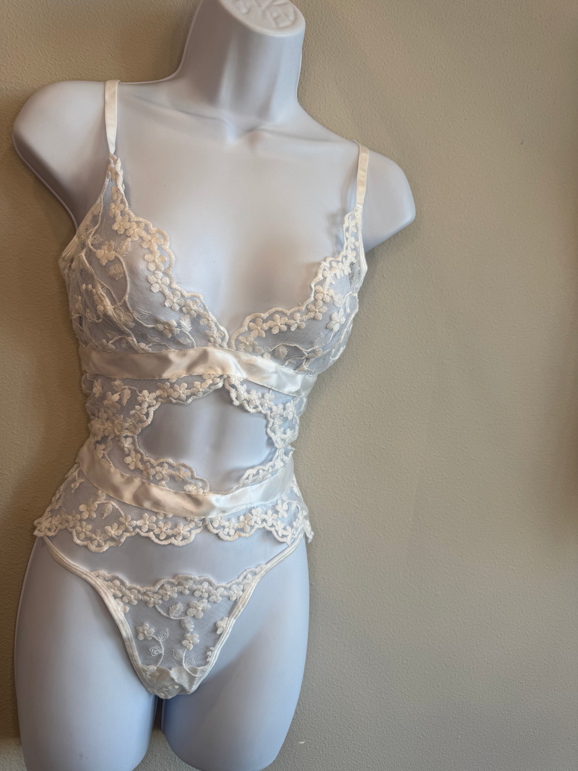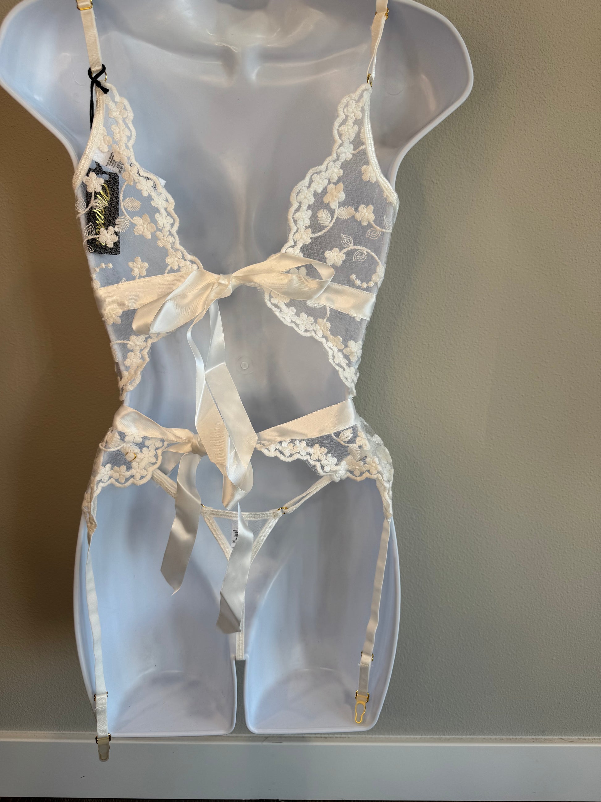 Shine bright on your wedding night - or any other special occasion with this two-piece set in embroidered mesh. The set includes adjustable straps, built-in garters, and a matching thong.