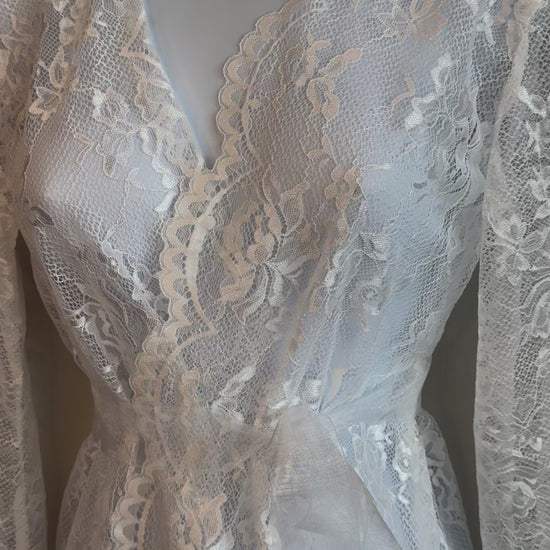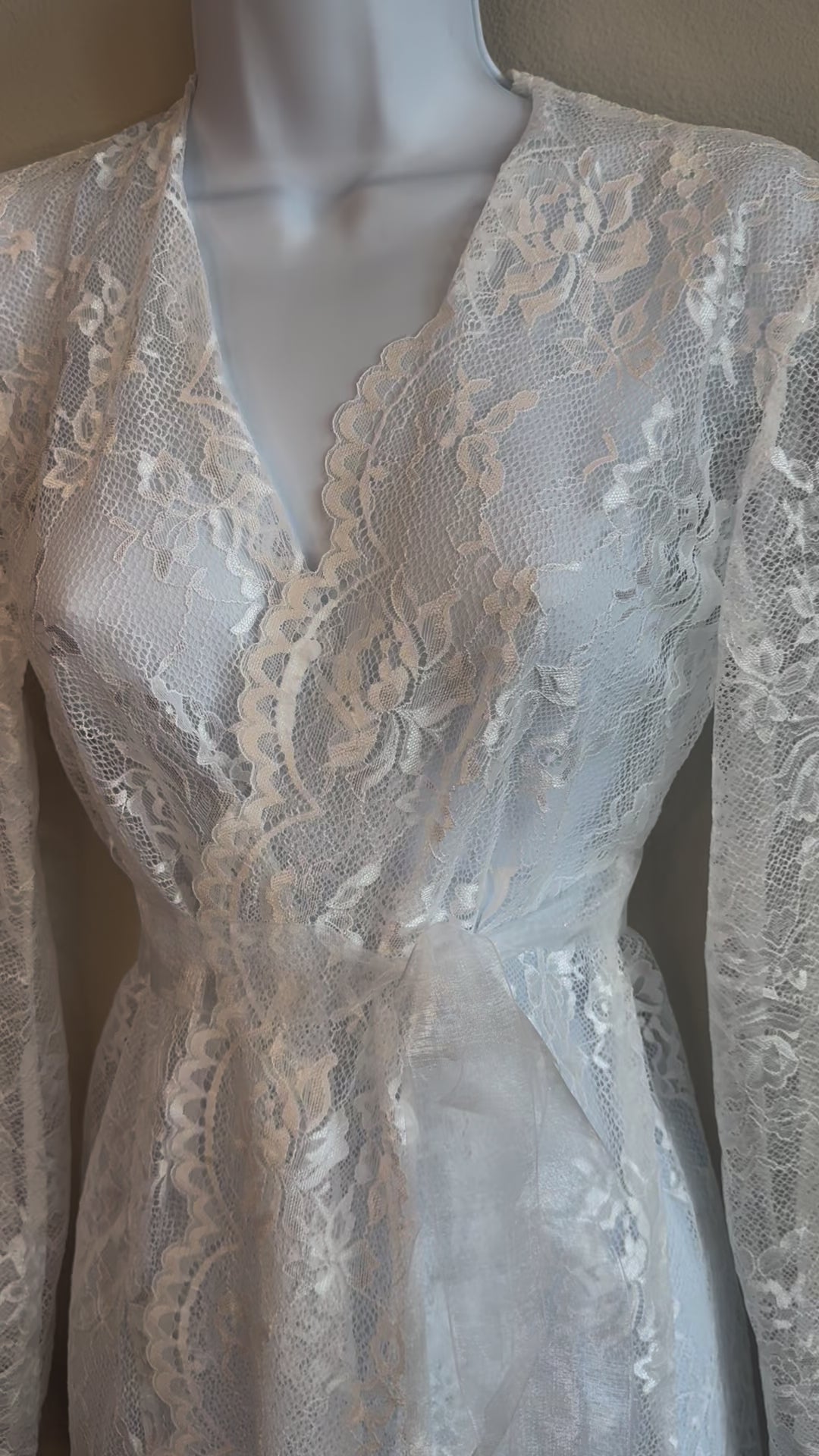 The front closure is designed to make a pretty v scalloped neckline. The butterfly sleeves are full length with scalloped trim that match the baby scalloped hemline.
